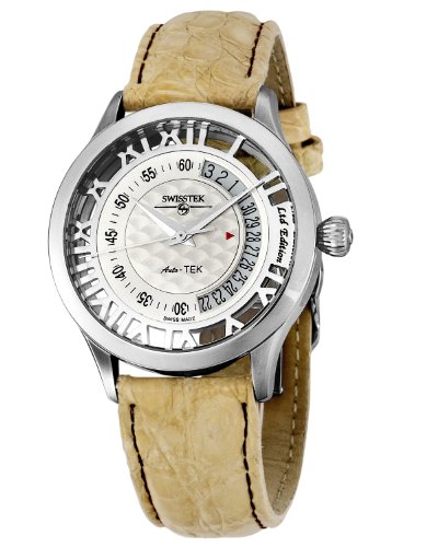Limited to only 100 pieces worldwide, the Men's Auto-Tek Automatic Watch is a gorgeous and comfortable self-winding timepiece made by respected Swiss watchmakers Swisstek. Powered by the movement of your arm, the watch also boasts an exposed date wheel, and an exhibition case back protected by a durable sapphire crystal. The beige strap is made of luxurious crocodile leather and fastens securely with the help of a push-button clasp with a buckle. The one-of-a-kind watch is water resistant to 165 feet (50 meters).